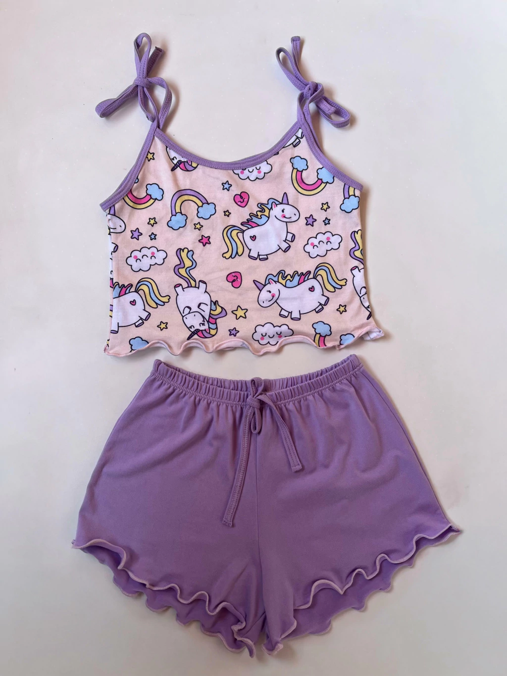 ⚠️ Atenção: A cor do short pode variar da foto, mas sempre será combinada com a estampa da blusinha, mantendo a harmonia do conjunto.