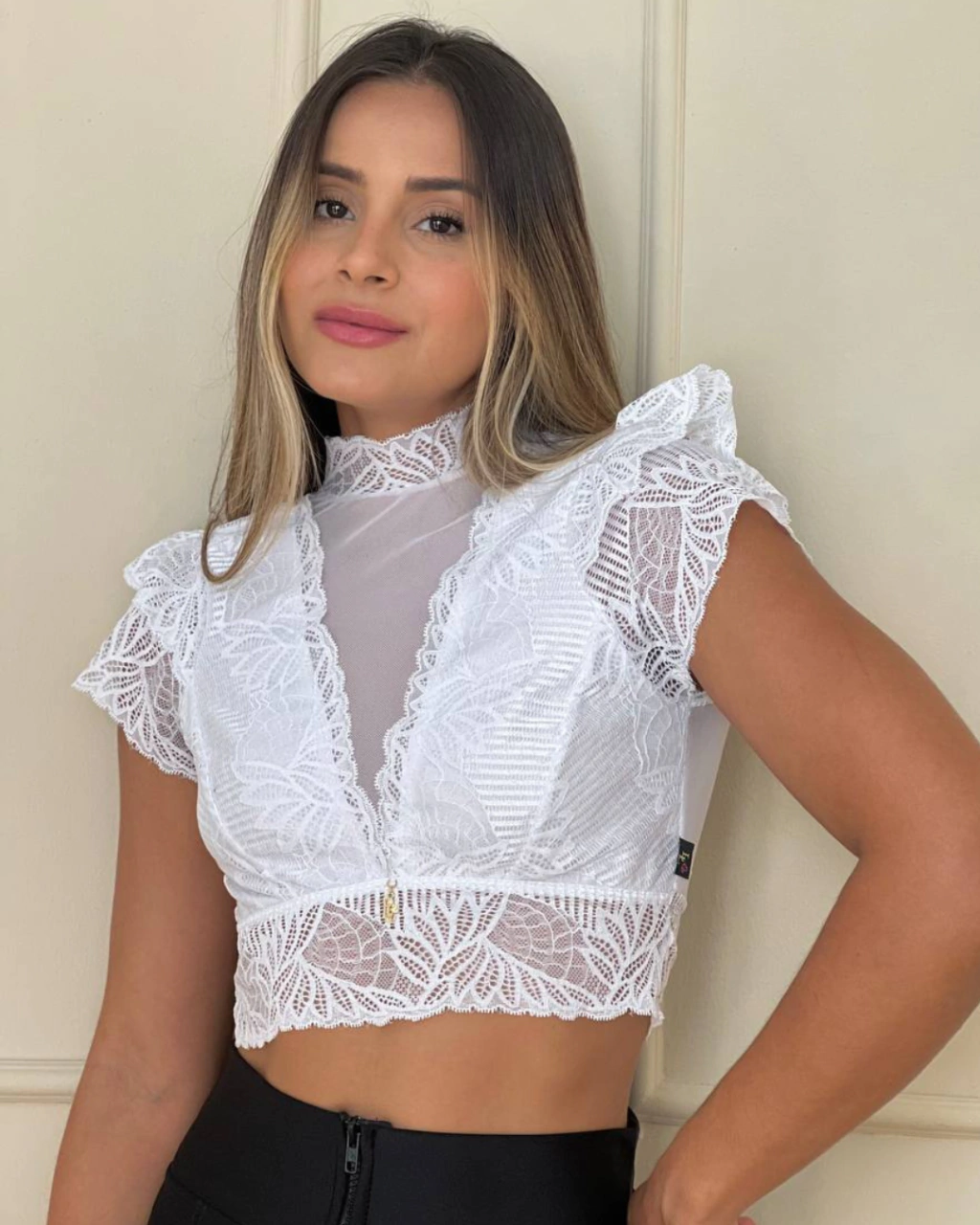 O Cropped de Renda com Tule é a escolha perfeita para quem busca uma peça elegante e sofisticada. Com detalhes em V realçando o decote, a combinação de renda e tule cria um visual delicado e sensual ao mesmo tempo. A peça é confeccionada em material de alta qualidade, garantindo conforto e durabilidade. Ideal para compor looks de festa ou para ocasiões especiais, o Cropped de Renda com Tule é uma opção versátil que pode ser combinada com saias, calças ou shorts para criar um visual único e impactante.